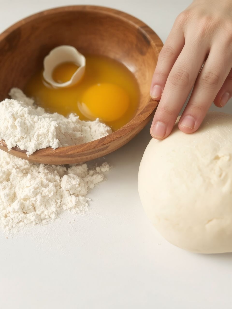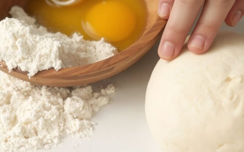 Tipp: Gyúrjuk a tésztát energikusan, legalább 10-15 percig, amíg sima, rugalmas és homogén nem lesz. A gyúrás során a liszt és a tojásfehérjék kölcsönhatásba lépnek, kialakítva a stabil glutén hálózatot.