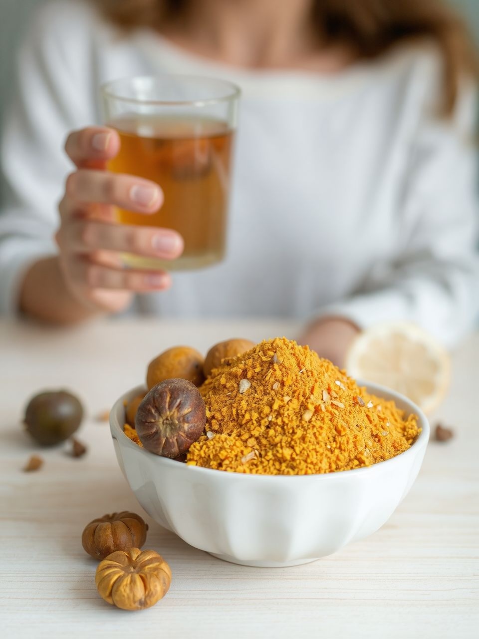 - Por: Ez a legtradicionálisabb forma. Általában egy teáskanálnyi (3-6 gramm) port kevernek el meleg vízzel, és éhgyomorra fogyasztják, lefekvés előtt vagy reggel. Az íze keserű és fanyar lehet, ezért sokan mézzel vagy ghee-vel (tisztított vajjal) keverik.