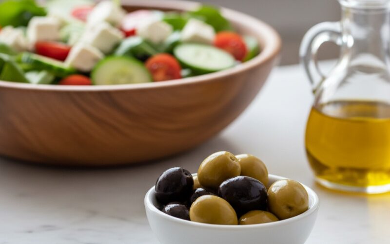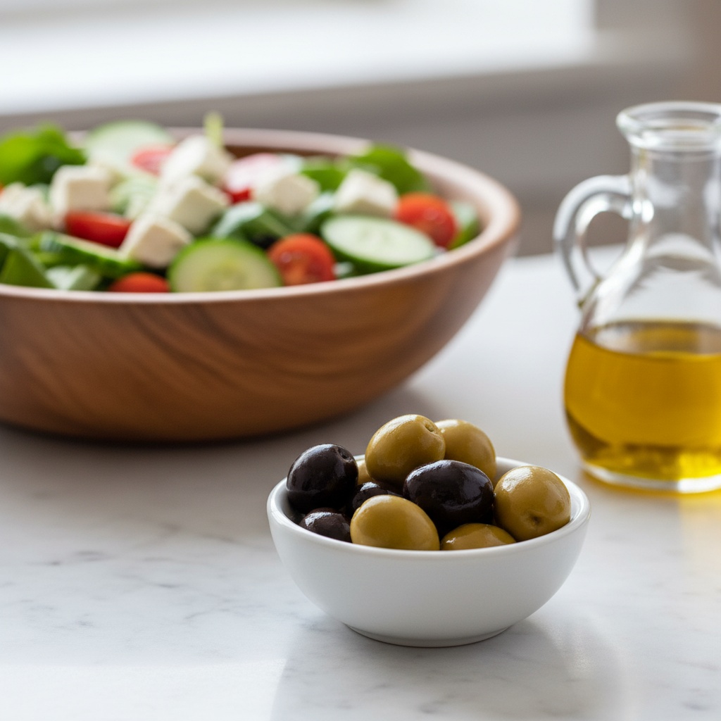 Az olivabogyó szinte bármilyen salátát feldob. A görög saláta (paradicsom, uborka, lilahagyma, feta, Kalamata olivabogyó) klasszikus példa, de remekül illik a zöldsalátákhoz, tészta salátákhoz, kuszkusz salátákhoz vagy akár a tonhalas salátákhoz is. A sós, umami íz mélységet ad az ételnek.