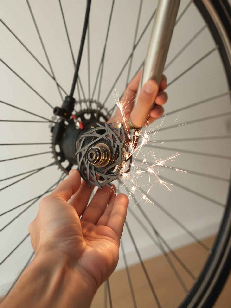 Egy animáció vizualizálhatná a kerékpár-dinamó működését, ahogy a kerék forgása áramot generál a lámpáknak.