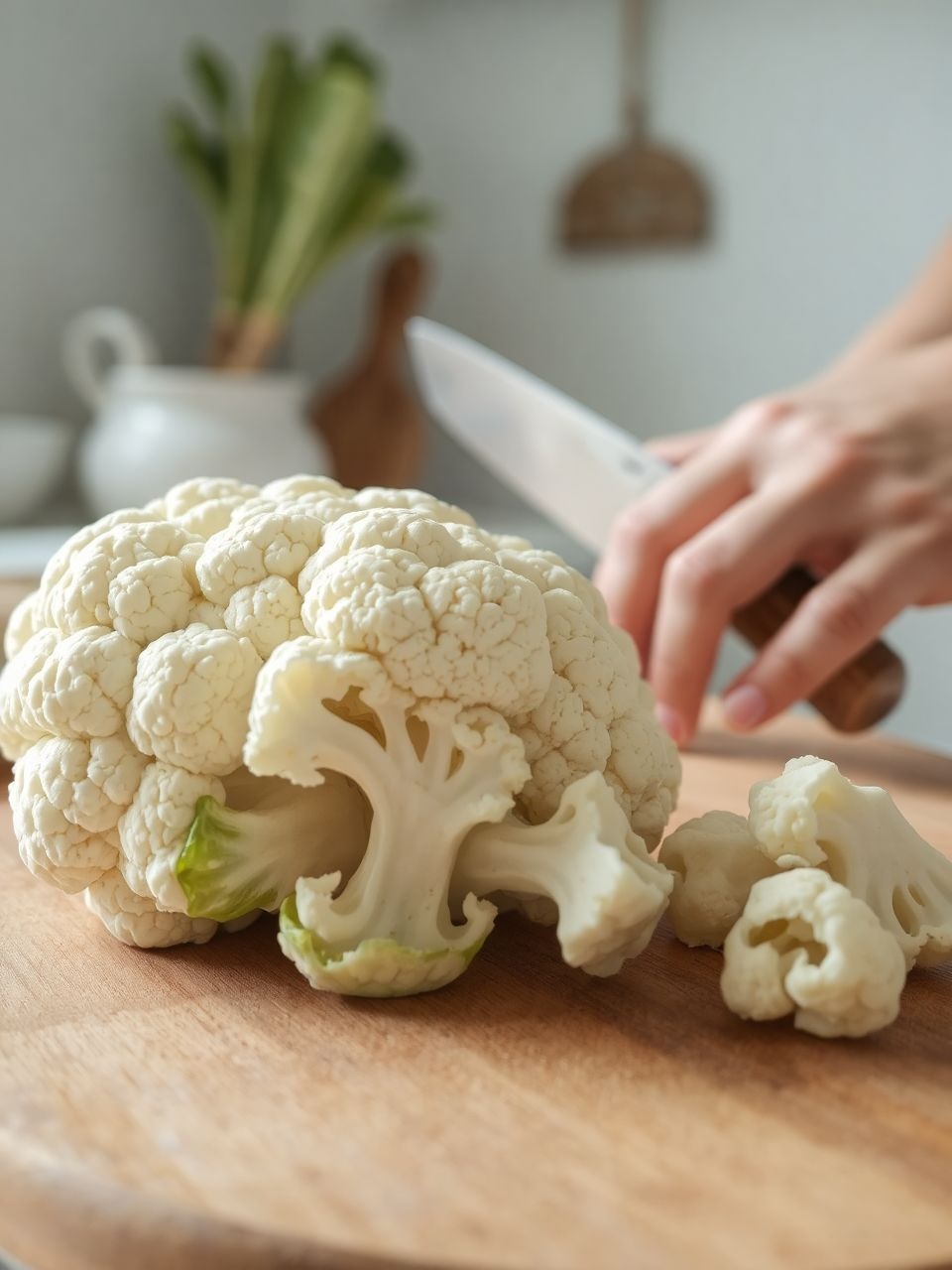 4. Rózsákra bontás: Egy éles késsel vagy kézzel bontsd kisebb, egyforma méretű rózsákra a karfiolt. Az egyforma méret fontos, hogy egyenletesen főjenek vagy süljenek meg.